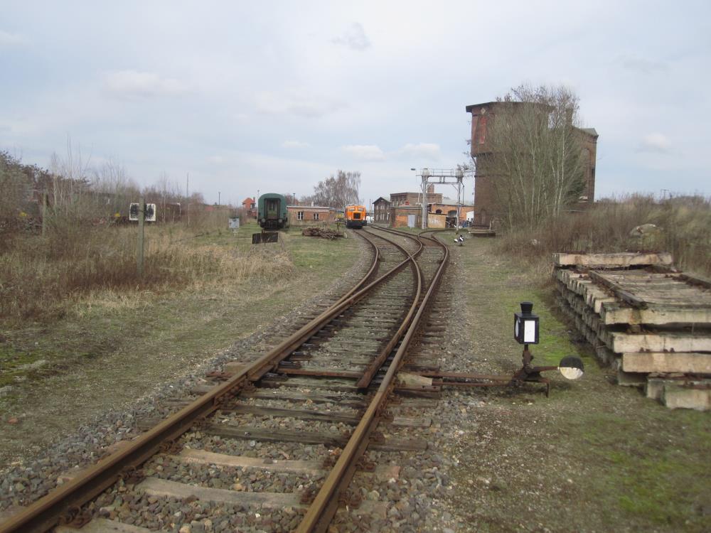 Das Bild zeigt den hinteren Teil der Gleisanlagen des Museums. Rechts hinter den Birken ist der Wasserturm zu erkennen, in der Mitte die Besandungsanlage. Links erkennt man weitere Büsche und Birken. Dort befand sich bis in die 1980er Jahre der zentrale Kohlelagerplatz des Bahnbetriebswerkes. Er hatte ein Fassungsvolumen von rund 3.500 Tonnen.