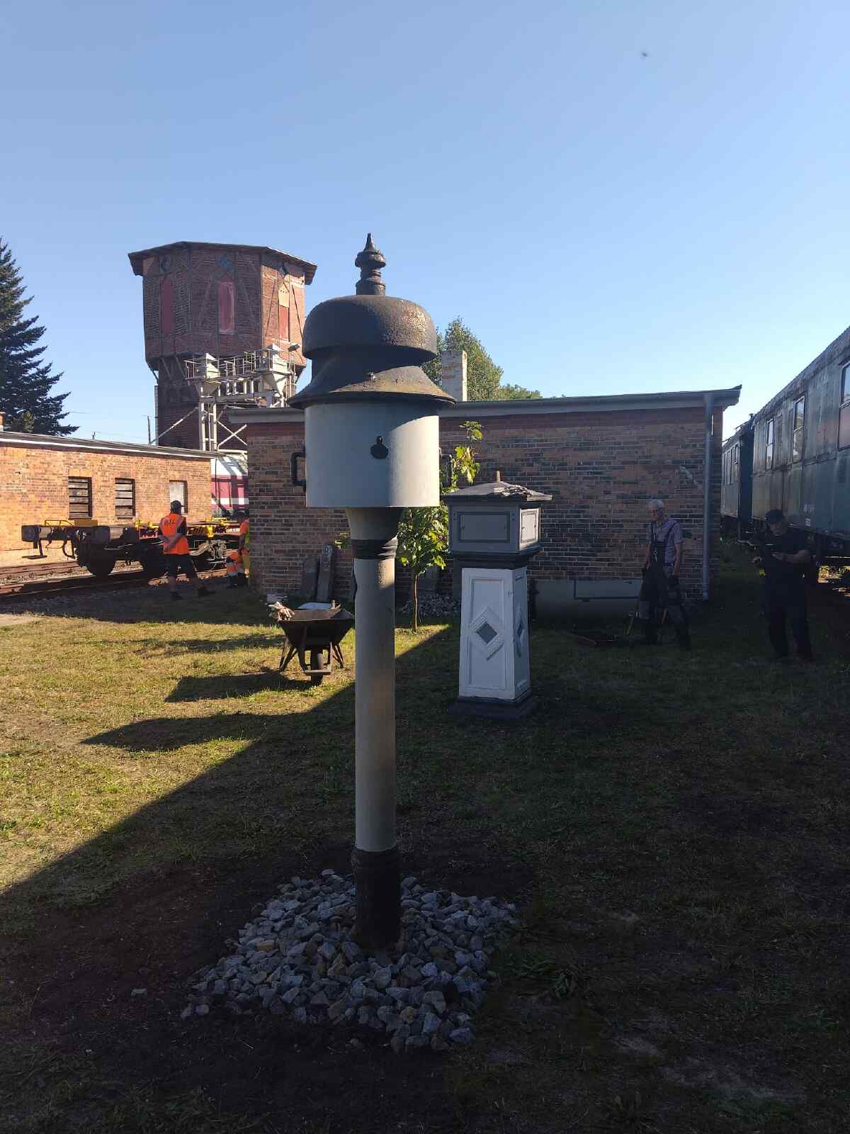 Am Sonntag fand dann der bundesweite Tag des offenen Denkmals statt. Auch hieran haben wir uns beteiligt und konnten etlichen Besuchern über unsere Aktivitäten zum Erhalt unseres Denkmals berichten. Heute können wir auch über eine weitere kleine Sensation berichten. Zwar ist leider der bekannte Stendaler Fachbuchautor und Eisenbahnliebhaber Wolfgang List vor einiger Zeit verstorben. Wir konnten uns aber mit der Familie dahingehend verständigen, dass unser Museum die umfangreiche Sammlung von Läutewerken übernimmt und ausstellt. Dabei handelt es sich um diverse, teilweise telefonzellengroße Geräte, die vor der Digitalisierung der Eisenbahn der Meldung von ankommenden und abgehenden Zügen per Morsezeichen dienten. Wolfgang List hatte solche Anlagen aus etlichen Teilen Deutschlands vor der Verschrottung bewahrt und in seiner Privatsammlung funktionsfähig restauriert. Nun bekommen die Teile in Wittenberge ihren würdigen Platz. Wir danken den Angehörigen noch einmal sehr herzlich für ihre Bereitschaft, uns die Sammlung zu übergeben. Wir haben vor einigen Tagen mit der Aufstellung der großen Ausstellungsstücke in unserem Freigelände begonnen.