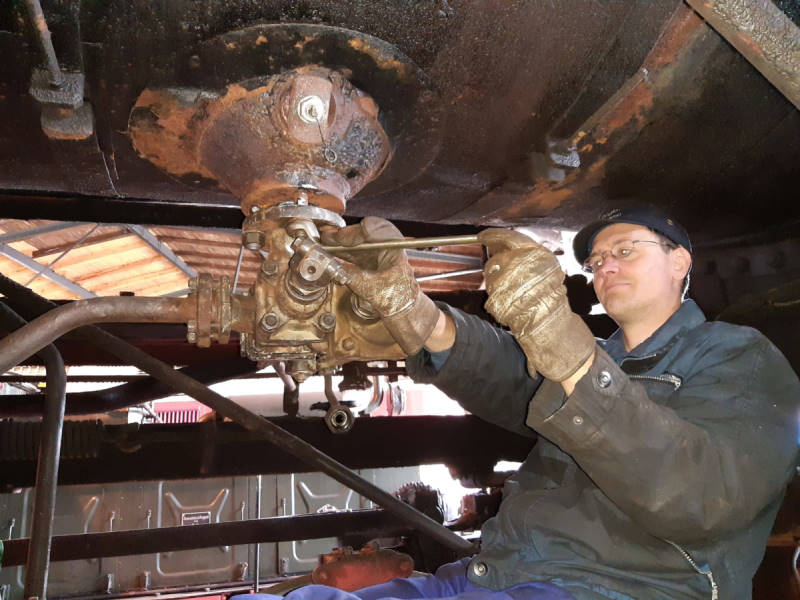 Schweiß lief auch bei weiteren Arbeiten an der Dampflok 50 3570. Hier wurde ein aufgearbeitetes Abschlammventil unter dem Kessel montiert und Wasserstandsanzeigen im Führerstand angeschraubt.