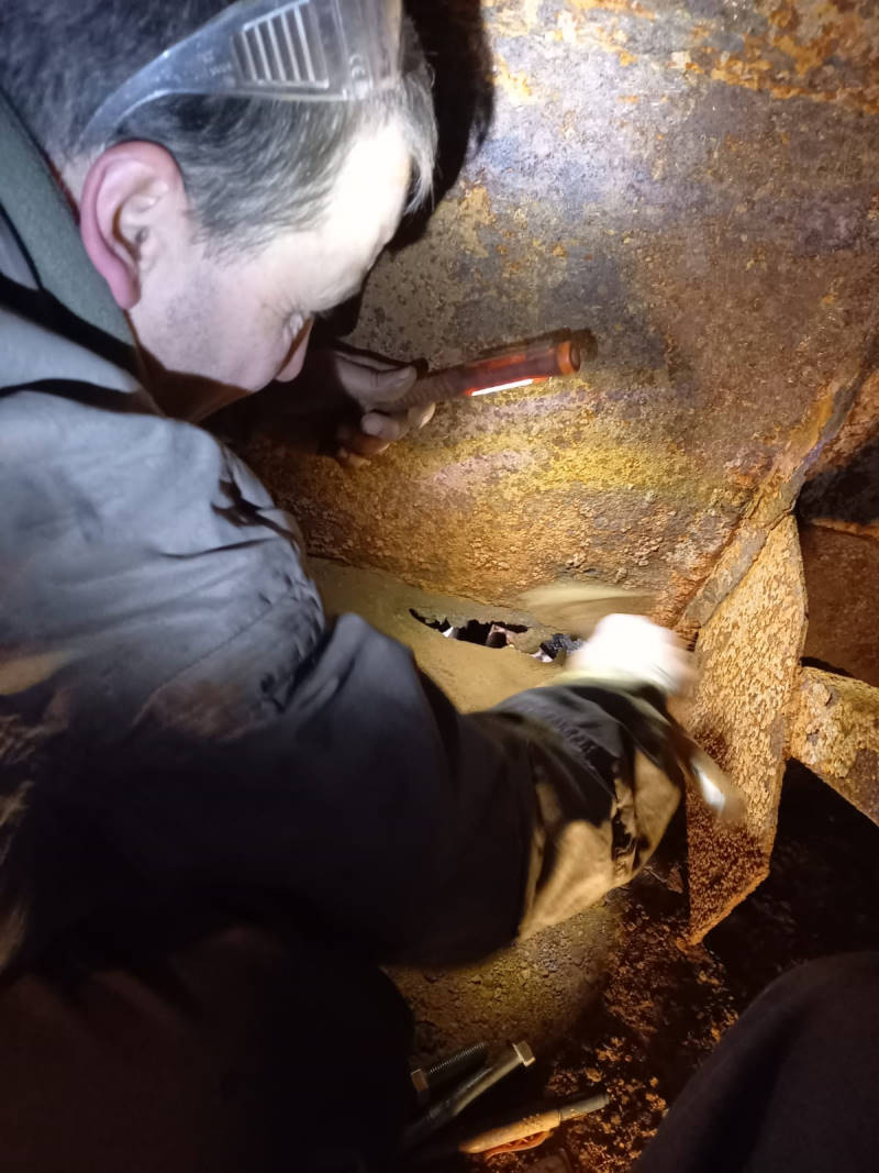 Auch am Tender für die Dampflok 50 3570 ging der unerbittliche Kampf gegen den Rost und Kalkablagerungen weiter. Heute wurde die Innenseite des Tenders von grobem Kalk befreit und die Verschlüsse der Ablaufventile gangbar gemacht. Mit ihnen kann der Wasserzulauf vom Wasserkasten des Tenders zur Lok unterbrochen werden, wenn es eine Störung an den Pumpen der Lok oder Wartungsarbeiten gibt. Die Arbeiten sind ziemlich mühsam, weil sich die Kollegen vom hintersten Ende des Tenders bis zur anderen Seite, die zur Lok zeigt, vorarbeiten müssen. Dabei mussten sie sich durch einige Aussparungen in den sogenannten Schwallblechen zwängen. Die Schwallbleche verhindern, dass das Wasser während der Fahrt ungebremst durch Tender schwappt. Die Arbeiten sind sehr unangenehm, da der Platz sehr begrenzt ist, es dunkel ist und die Geräusche stark hallen. Keine Arbeit für Menschen mit Platzangst.