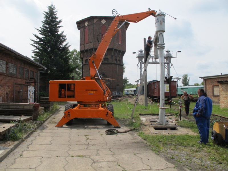 Die Vereinsmitglieder arbeiten fortwährend am Ausbau der Infrastruktur im Museumsgelände. Am 28.6.2014 war wieder ein sichtbarer Schritt geschafft: Vier Vereinskollegen errichteten an historischer Stelle neben dem Wasserturm einen Wasserkran, um Dampflokomotiven mit Wasser zu versorgen.