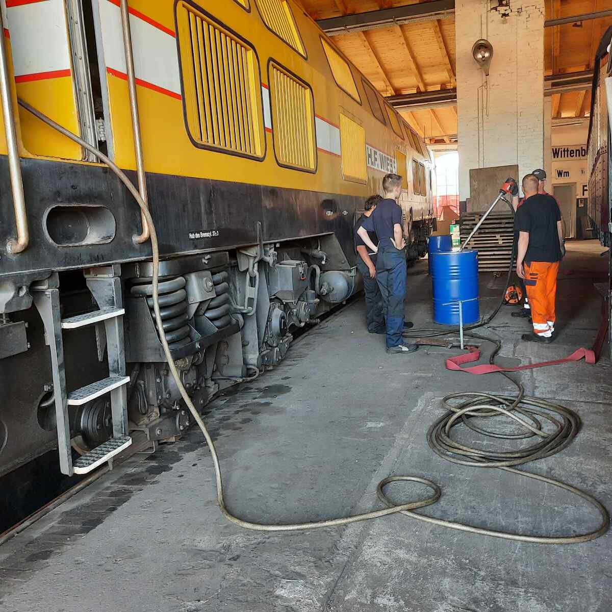 Der 3. Juni 2023 war für uns ein großartiger Tag, denn es lagen seit langem nicht mehr gehörte Geräusche in der Luft. Das hatte folgende Hintergründe: Die Aufarbeitung weiterer Diesellokomotiven wurde begonnen. Dazu zählt zunächst unsere Diesellok 118 748. Diese Maschine wurde 1968 beim Lokomotivbau Karl Marx in Babelsberg gebaut und war bis Mai 2015 im Einsatz, zuletzt vor Güterzügen. Sie verfügt über zwei Motoren mit je 1.000 PS und kann bis zu 120 km/h schnell fahren.