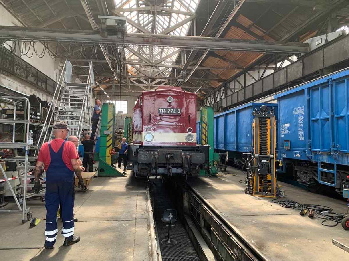 Am vergangenen Samstag wurde ein weiterer großer Schritt bei der Hauptuntersuchung unserer Diesellok 114 774 geschafft. Nachdem nun alle Arbeiten am Fahrwerk und am Rahmen der Lokomotive abgeschlossen wurden, konnte die Lokomotive wieder auf ihre „eigenen Füße“ gestellt werden. Das bedeutete für die Aktiven, dass sie die Lok wieder auf ihre Drehgestelle und damit auf ihre eigenen Achsen stellen mussten. Das war ein spannender Moment und Millimeterarbeit, hat aber zur großen Erleichterung der Beteiligten gut geklappt. Natürlich haben wir bei dieser Aktion auch ein paar Fotos aufgenommen, die wir Ihnen nicht vorenthalten möchten.
