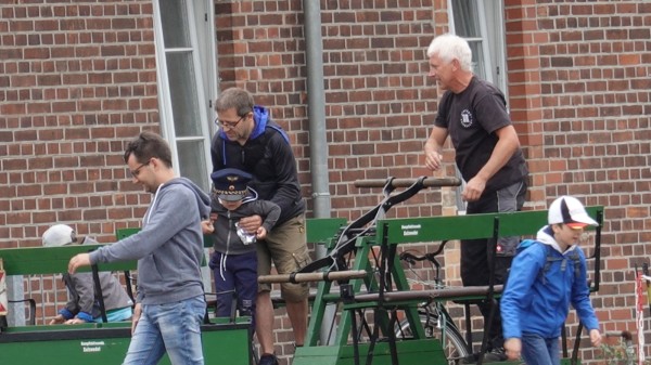 Aber nicht alle bleiben Schaulustige. Gleich am Eingang wartet eine Handhebeldraisine von 1910. Die erste Hälfte ihrer Tour wird im Schlepp eines Schienen-Trabbis von 1965 absolviert, der Rückweg per Muskelkraft zurückgelegt. „Das ist weniger anstrengend, als es aussieht“, meint Vereinsmitglied Guido Huwe, der am Sonnabend als Conductor fungiert. „15 Stundenkilometer schaffen wir hier heute. Tempo 30 ist möglich. Und wir sind schon 72 Kilometer an einem Tag gefahren.“ Dennoch nimmt der eine oder andere lieber im Schienenauto Platz.